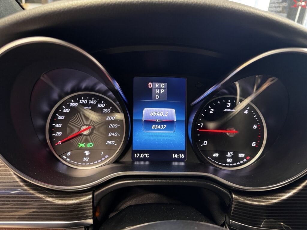 Mercedes-Benz lettering at entrance, illuminated